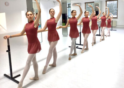 V baletni šoli, ki obsega 6 razredov, učenci vse bolj poglobljeno spoznavajo balet in širijo klasični baletni vokabular. Učna ura (klas) se začne s talnimi vajami za moč in raztegljivost (samo v prvih razredih), nadaljuje pri drogu z vajami ki postopno ogrejejo telo in ga pripravijo za delo na sredini. Sredina je sestavljena iz adagia (počasnih vaj, ki zahtevajo ravnotežje in vztrajnost) in allegra (hitrih in poskočnih vaj z zapletenimi koordinacijami nog), na koncu ure pa sledi še ples na špicah. Tega se učenke lotijo, ko so po presoji pedagoga dovolj močne in stabilne, pa tudi telesno primerno razvite (običajno v 4. razredu baleta). Učenci na baletni šoli pridobijo veliko ustvarjalnih in odrskih izkušenj – udeležujejo se mnogih društvenih nastopov, najbolj uspešni pa tudi slovenskih baletnih revij in tekmovanj. Pri tem razvijajo samozavest, zmožnost skupinskega sodelovanja, in premagujejo tremo pred nastopanjem.